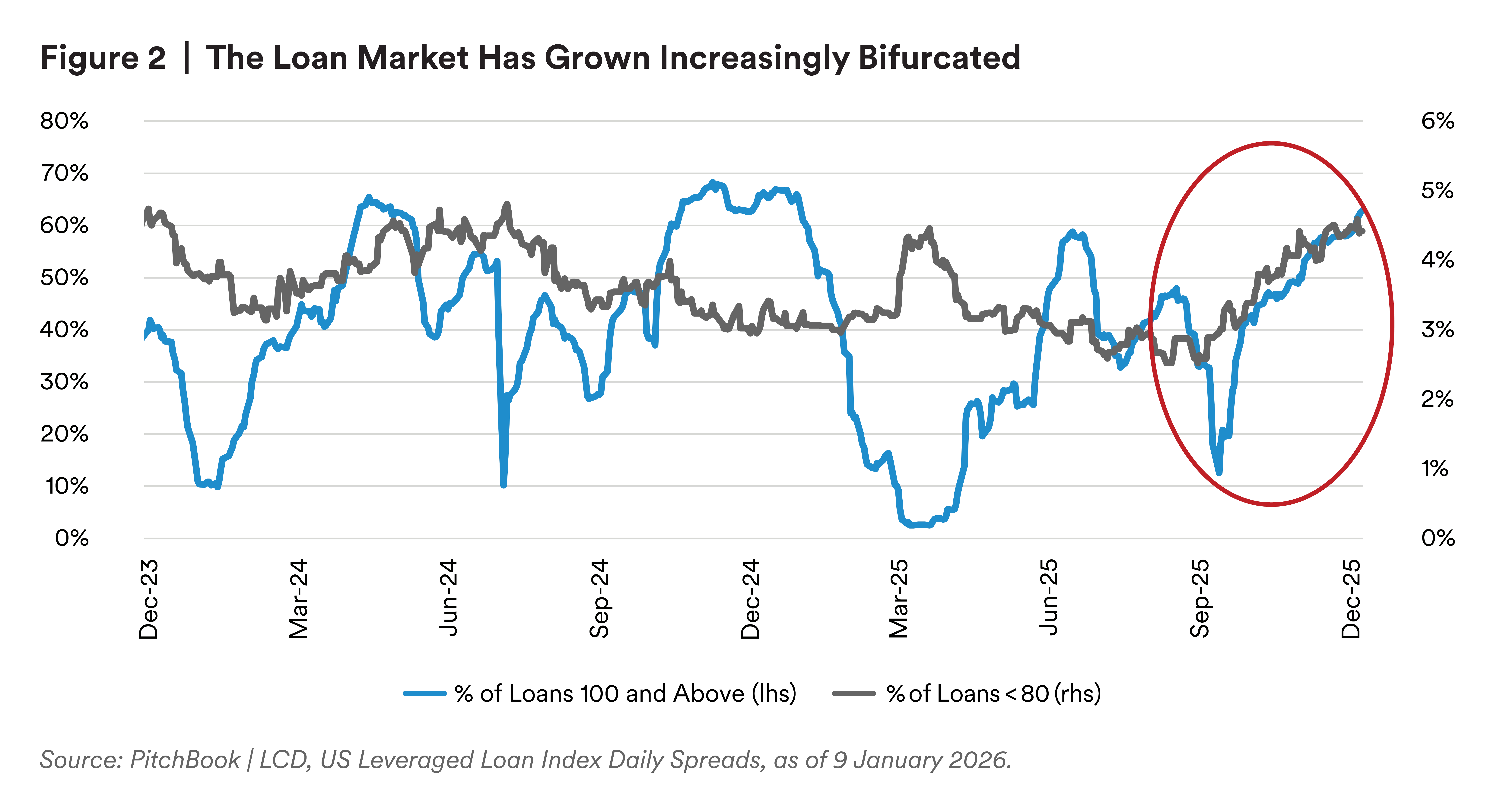That being said, healthy fundamentals and limited maturities over the next two years should limit distress within the broader loan market. Indeed, measures of distressed activity, including payment defaults and LMEs, trended lower through the fourth quarter of 2025. However, the percentage of the loan market trading below 80, a common measure of distress, increased during the same period, which suggests this trend may flatline. While loan portfolios have seen some spread tightening, this has been largely repricing-driven and is a result of strong loan technicals, in addition to good credit performance.