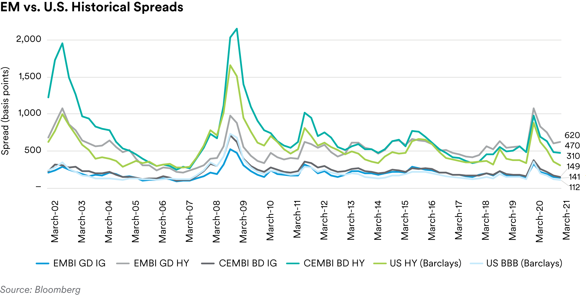 The upcoming pipeline suggests that April will kick off another strong quarter of issuance. We project that flows into the asset class will continue as bond yields rise to accommodate the increasing treasury yields and investors continue to get compensated for the additional risk versus U.S. credits. Default rates in EM have seen a return to normalcy after the elevated levels seen in 2020. EM corporate defaults are projected to be 2.5% for 2021, while the U.S. HY default rate has been revised down to 2% for 2021.1