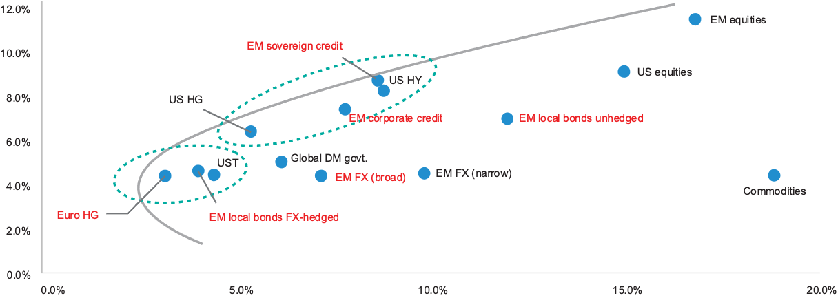 Source: J.P. Morgan - Sharpe rations since 2003, X –axis, Average Annual Volatility (%), Y-Axis: average annual return (%). As of September 2020.