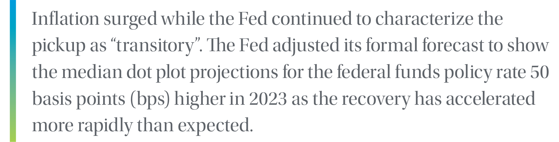 Recap: The second quarter saw front-end interest rates rise while those further out the curve declined as economic data continued to validate the reopening of the economy. Hiring maintained an impressive pace in the second quarter, although we saw below-consensus prints for nonfarm payrolls as the continuation of unemployment benefit payments was cited as a headwind to returning sidelined workers. Inflation surged while the Fed continued to characterize the pickup as “transitory”. The Fed adjusted its formal forecast to show the median dot plot projections for the federal funds policy rate 50 basis points (bps) higher in 2023 as the recovery has accelerated more rapidly than expected. Additionally, in his press conference, Chair Powell confirmed that the June meeting was the “talking about talking about” tapering meeting, validating market expectations while leaving investors hoping that more specifics on the topic will be revealed at the Jackson Hole symposium in late August. Several committee members including Bullard, Bostic and Kaplan all advocated for tapering to begin sooner rather than later. This more hawkish than expected FOMC meeting flattened the yield curve substantially as a more aggressive normalization timeline weighed on front-end and intermediate interest rates. In the very front end of the yield curve, the ongoing glut of cash in the funding markets pushed usage of the Fed’s overnight reverse repo program (RRP) to record highs, approaching $1 trillion. To preserve the integrity of the lower bound of very short tenor interest rates, the Fed executed a technical adjustment at the June FOMC meeting, raising both interest on excess reserves (IOER) and the rate offered via the RRP by 5 bps.