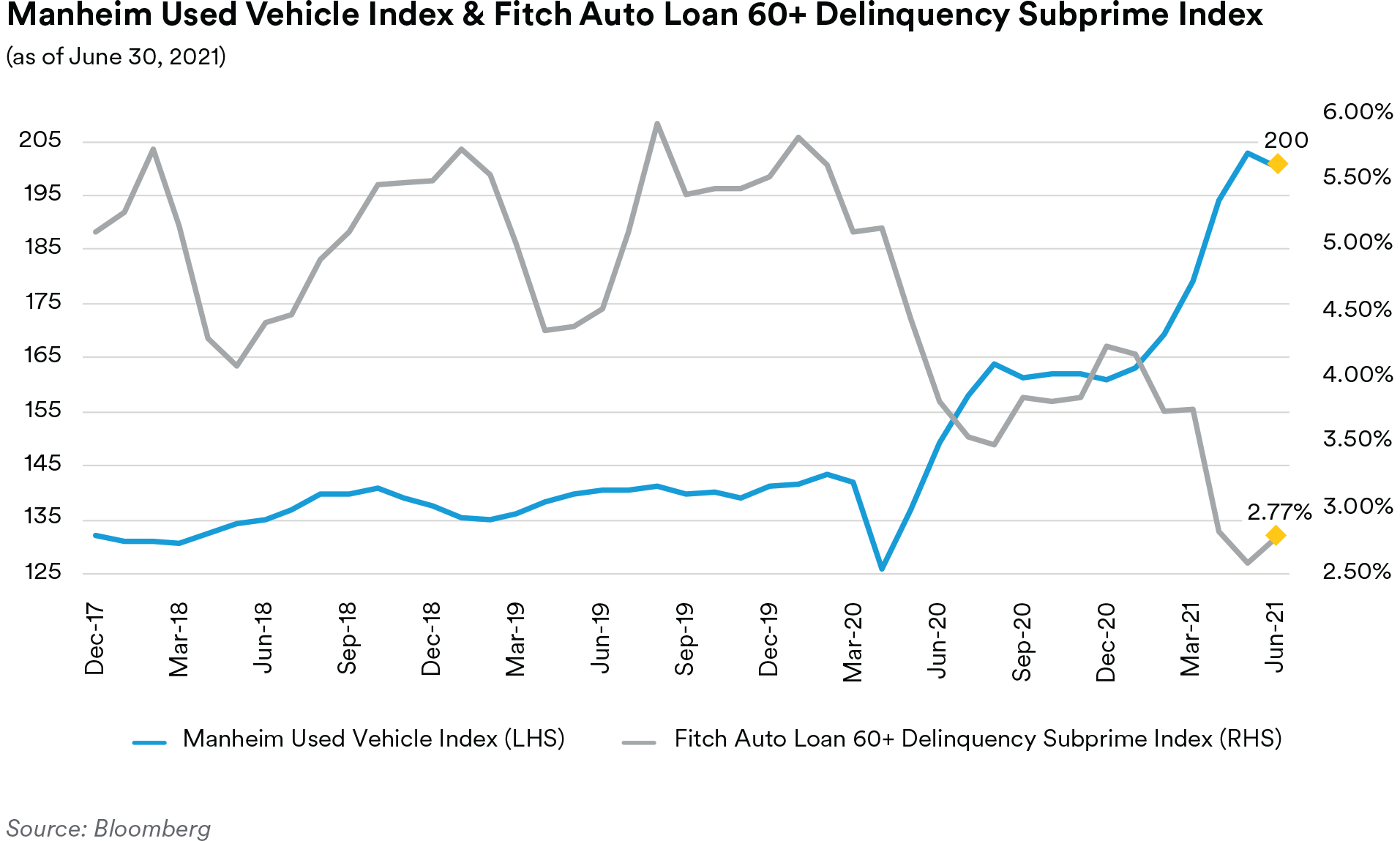 New vehicle sales numbers remain healthy but showed signs of a slowdown as the global computer chip shortage constrained new auto production and dealer inventory levels. Sales numbers printed at an 18.5 million SAAR (seasonally-adjusted annualized rate) pace in April, a 16-year high, but declined in both May (to 17.0 million SAAR) and June (to 15.4 million SAAR). In our view, with the consumer on generally solid footing, demand for new vehicles should remain strong with supply and rising prices the primary constraints upon sales going forward. Notably, the tight market for new vehicles has pushed used car prices to record levels. The Manheim Used Vehicle Index printed at successive record highs through the second quarter and closed June with a 200.4 print, up 36.4% year-over-year. Manheim noted all major market segments saw prices rise on a year-over-year basis in June, with pickup trucks and vans outperforming the overall market. Manheim also indicated that while prices continue to increase, the pace of gains is decelerating.