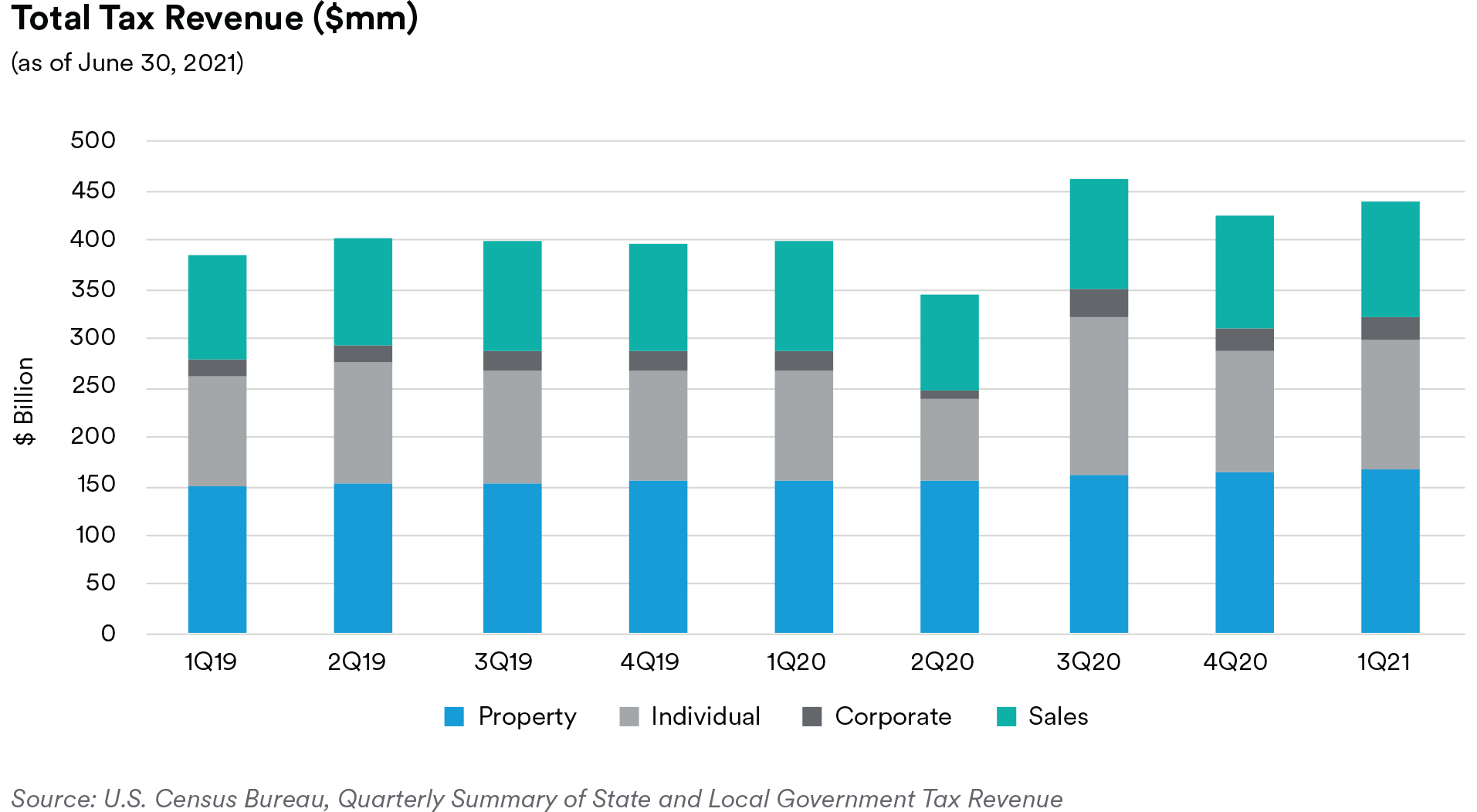We believe fundamentals remain strong as state tax revenues have significantly outpaced expectations from the depths of the COVID recession. Tax revenues have clearly benefited from the employment recovery, the easing of COVID-related restrictions and the improvement in consumer balance sheets. In fact, the Urban Institute reported that halfway through FY2021, 22 states have reported revenue rates at or exceeding their respective FY2019 levels. Additionally, the recent $350 billion passed in state and local stimulus, representing a large portion of state budgets, has clearly helped ease short-term budgetary pressures by increasing state “rainy day” funds. Finally, strong equity capital market returns have helped bolster state pension funding levels. Interestingly, Moody’s felt comfortable upgrading either ratings and/or outlooks for both New Jersey and Illinois over the quarter, even as a handful of states’ legacy liability profiles remain stressed.