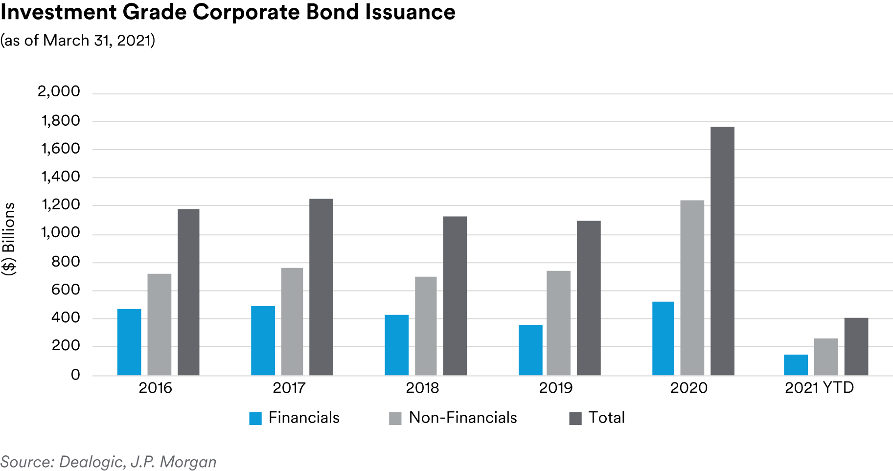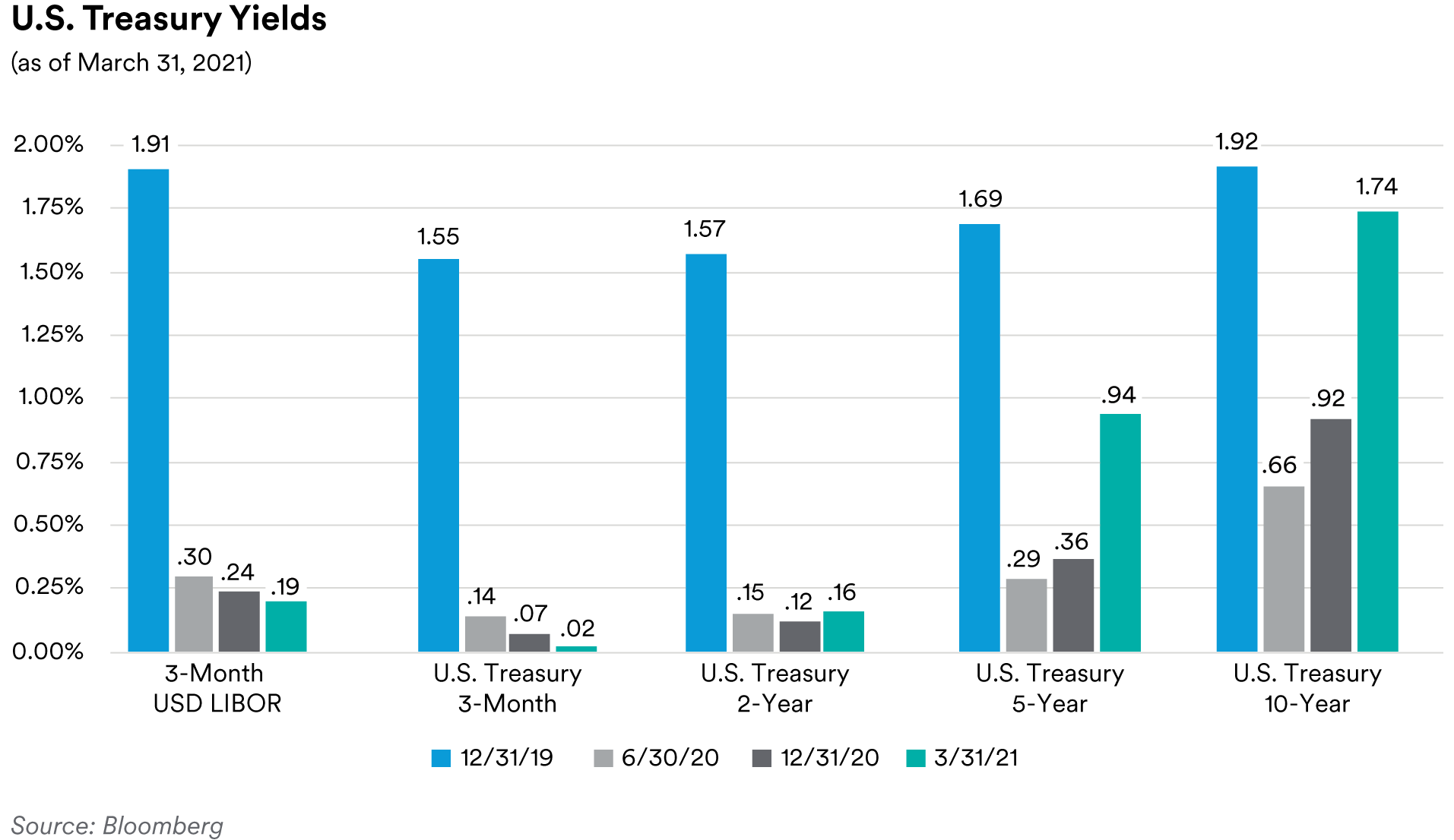 Recap: The first quarter was marked by a significant increase in Treasury yields as economic optimism linked to vaccine rollouts in the U.S. and another round of fiscal stimulus pushed 10-year yields as high as 1.77%. While the realized data did not reveal a surge in economic activity or inflation, expectations for a strong rebound pushed both inflation breakeven rates and real yields meaningfully higher. Although Treasury rates moved significantly higher, the Federal Reserve remained quite dovish. The most salient takeaway from the March FOMC meeting was the lack of change to the Fed “dots”, which continued to show a median projection of Fed Funds at the lower effective bound through the end of 2023. Committee members across the dove / hawk spectrum signaled comfort with the increase in yields given that the repricing was based on an improving economy and showed no indication of preparing to offset the selloff in Treasuries. In the very front end of the yield curve, a massive supply of cash in the market led to significant downward pressure on short dated interest rates during the quarter. This was not only a function of the Fed’s quantitative easing purchases, but also due to paydowns of Treasury Bills and a declining Treasury General Account. With some repo rates trading negative, the end of the quarter saw a meaningful increase in the usage of the Fed’s Reverse Repurchase facility.