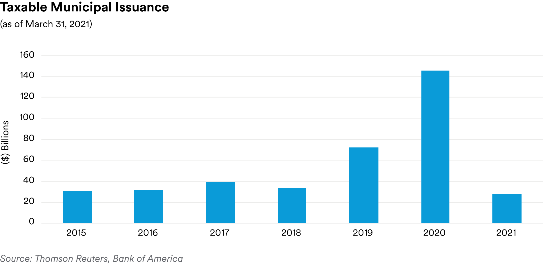 Taxable issuance has been stable but due to higher interest rates, we would not expect supply to increase significantly without the federal government passing into law a large infrastructure spending package along the lines of the $2.25 trillion proposal announced by the administration. There are several different ways a federal infrastructure plan could affect the municipal market. When the federal government provides funding for infrastructure, state and local governments, as well as transportation agencies, often need to raise additional funding via the municipal bond market to finance their portion of a project. We would expect issuers to use the tax-exempt market to raise money when they are legally able to do so to save on financing costs, likely seeing some taxable issuance in that scenario as well. In addition, there has been talk of introducing a program, similar to the Build America Bonds (BABs) Program from 2009 – 2010, where interest payments on qualifying taxable bonds would be subsidized by the federal government. Like the BAB program over a decade ago, we would expect a significant increase in taxable supply if such a scenario comes to fruition.