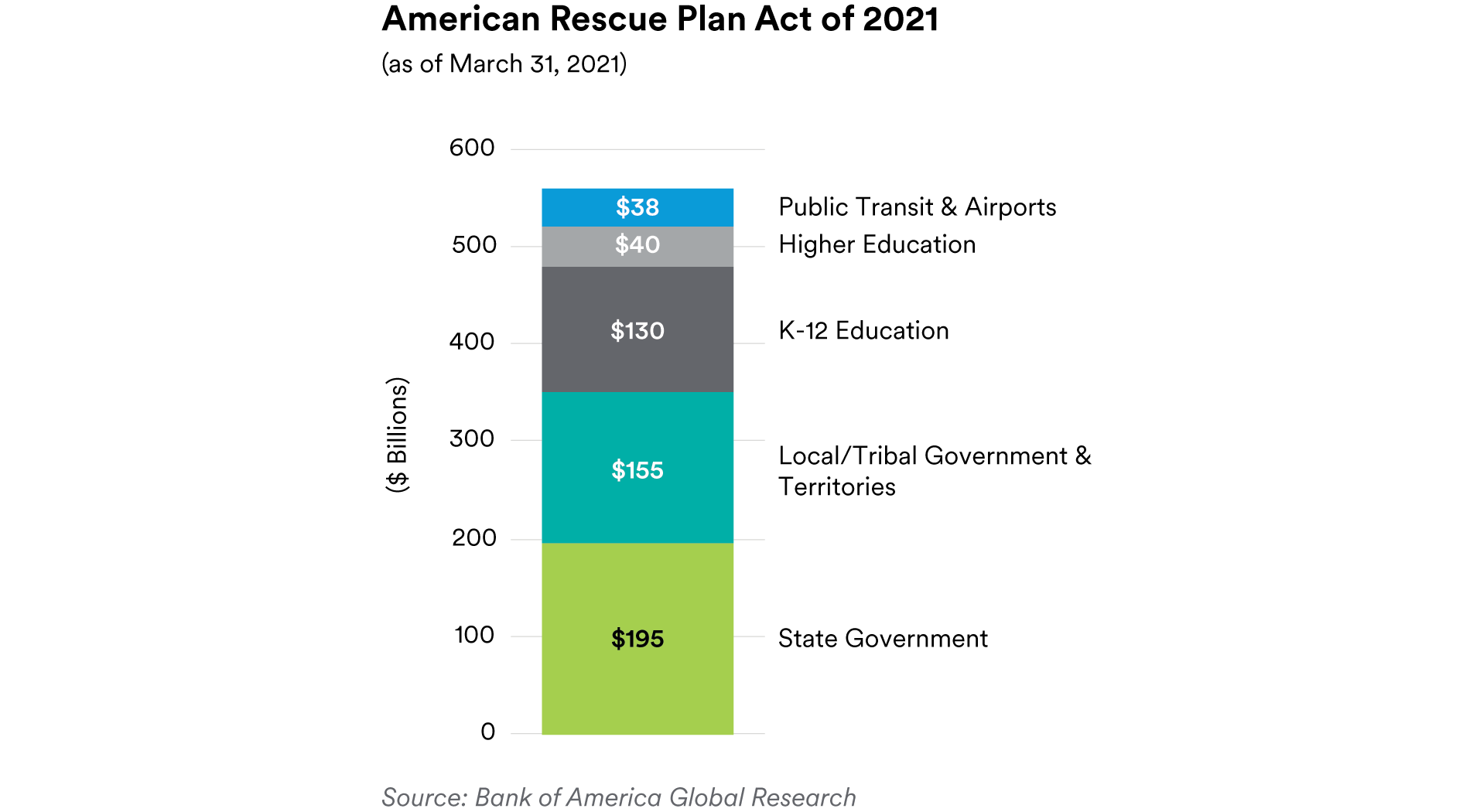 The first several months of the Biden Administration have ushered in an unprecedented number of executive orders and the passage of a $1.9 trillion stimulus package. Between managing the pandemic response and dealing with the flood of immigrants at the southern border, other initiatives such as tax reform, Medicare/Medicaid expansion and infrastructure have taken a back seat but will likely be addressed before the end of the year. The $1.9 trillion American Rescue Plan Act of 2021 included $350 billion for state and local governments, $40 billion for higher education, $30 billion for public transit, and $8 billion for airports. Many of these entities have successfully weathered the pandemic and are already in decent financial shape, so this stimulus should further boost liquidity and provide funding for previously planned projects.
