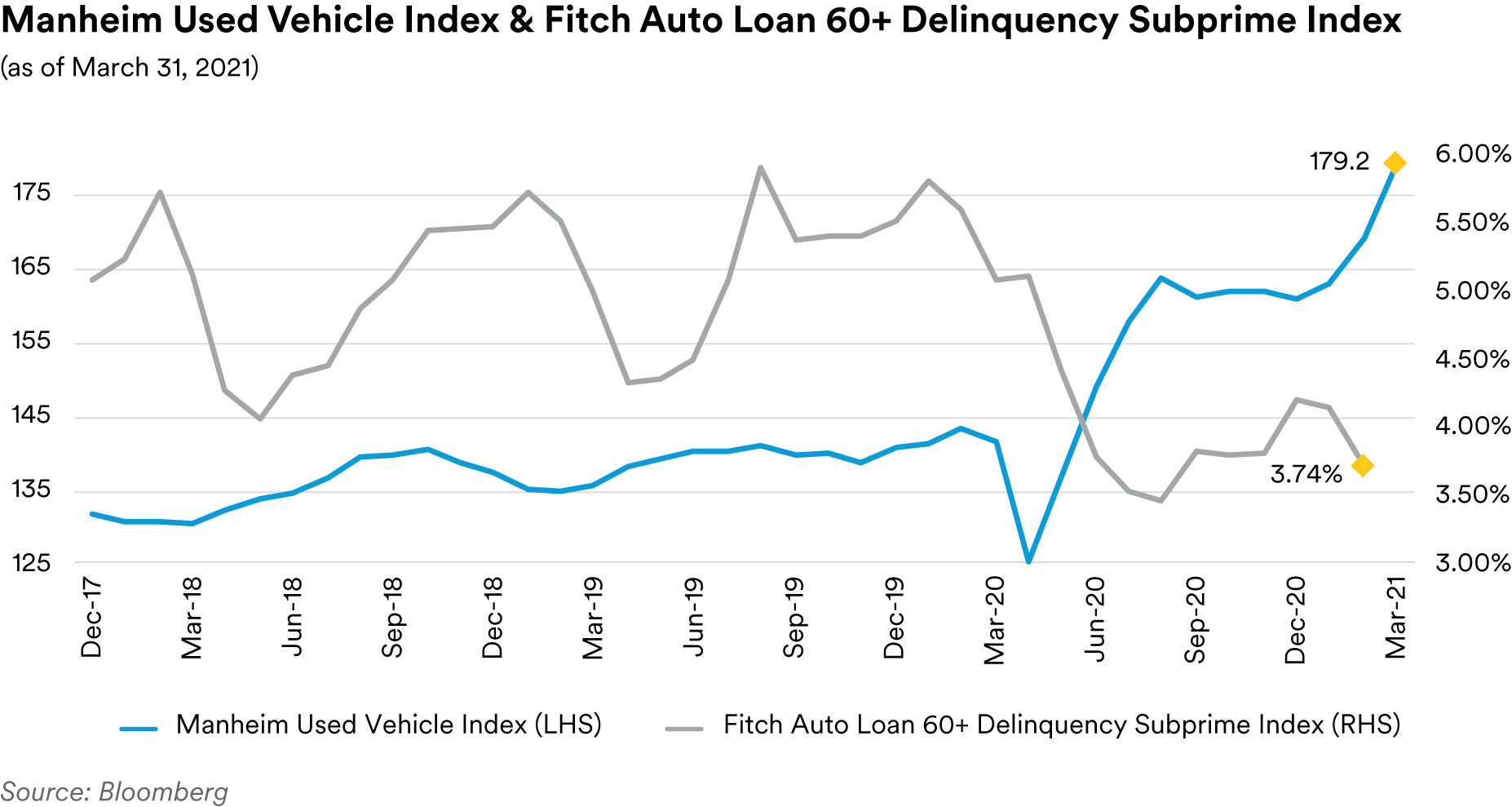 The healthy auto market, government stimulus payments and loan forbearance programs continue to provide support to ABS auto trust performance metrics. Through February, the 60+-day delinquency rates on the Fitch Auto ABS indices were 0.23% for the prime index and 3.74% for the subprime index, which reflect decreases from year-ago levels of 7 basis points and 188 basis points, respectively. Likewise, annualized net loss rates for the indices stand at 0.36% for the prime index and 5.48% for the subprime index, 19 basis points and 394 basis points lower year-over-year, respectively. As we have noted previously, we believe auto trust performance will begin to deteriorate once stimulus payments are exhausted and forbearance programs are wound down. However, with the administration continuing to use government stimulus payments to battle the pandemic and support the economy, we do not expect this in the near term and, regardless, we believe that the short-tenor tranches held in our portfolios have ample credit enhancement to offset deteriorating collateral credit performance.