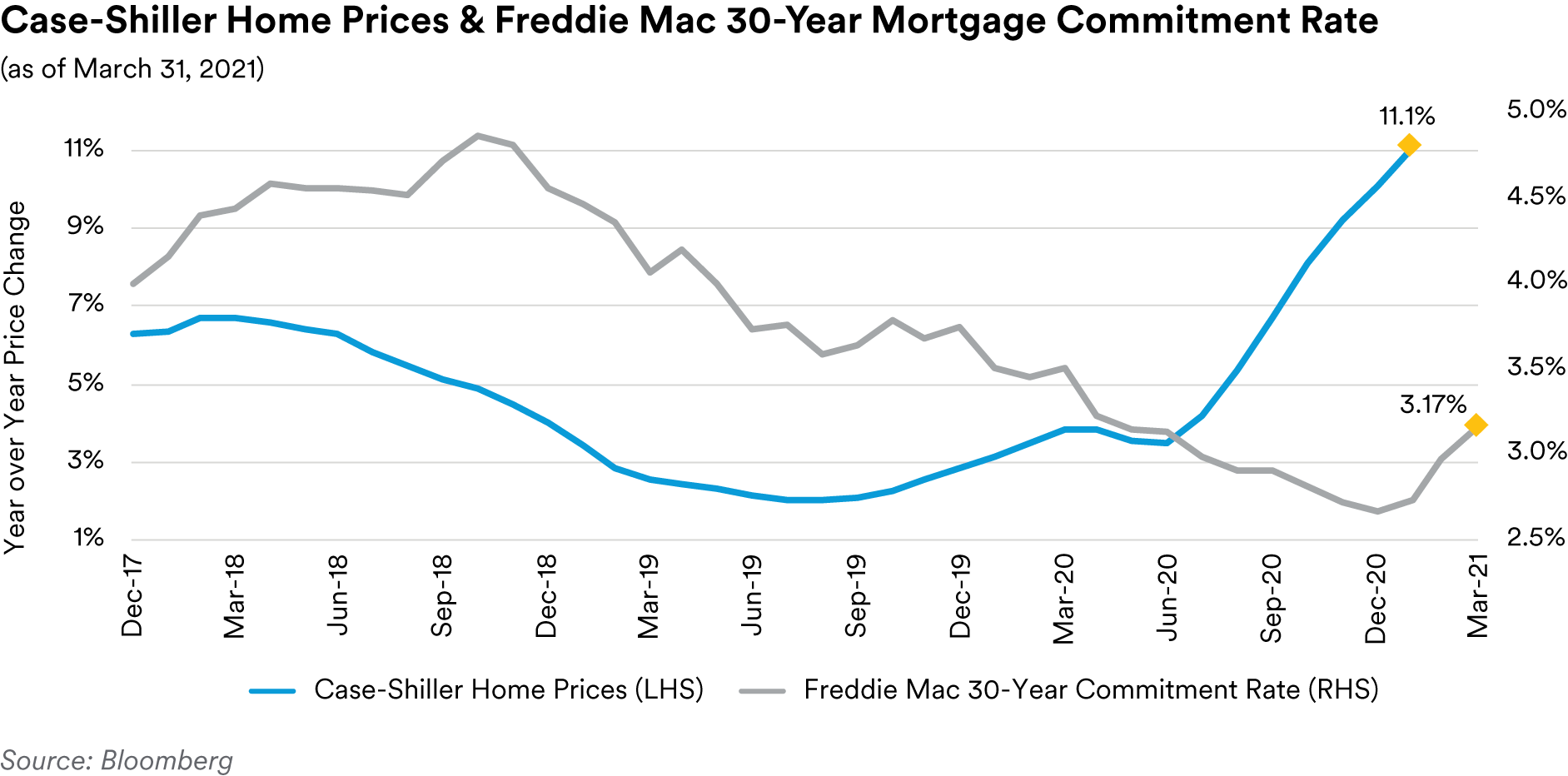 On the regulatory front, in March, Republican Senator Pat Toomey released guidelines towards ending government control of Fannie Mae and Freddie Mac. However, his proposals would require support from Democrats which we consider unlikely. In fact, Democratic Senator Sherrod Brown, Chairman of the Senate Banking Committee, has instead signaled a preference for Fannie and Freddie to be treated more like government-controlled utilities with the goal of expanding access to affordable housing and increasing racial equity. This aligns with goals outlined in a recent paper authored by Lewis Ranieri, a former bond trader regarded by many as the “father of mortgage-backed securities”. In our view, significant GSE reform is unlikely to gain much traction for the foreseeable future.