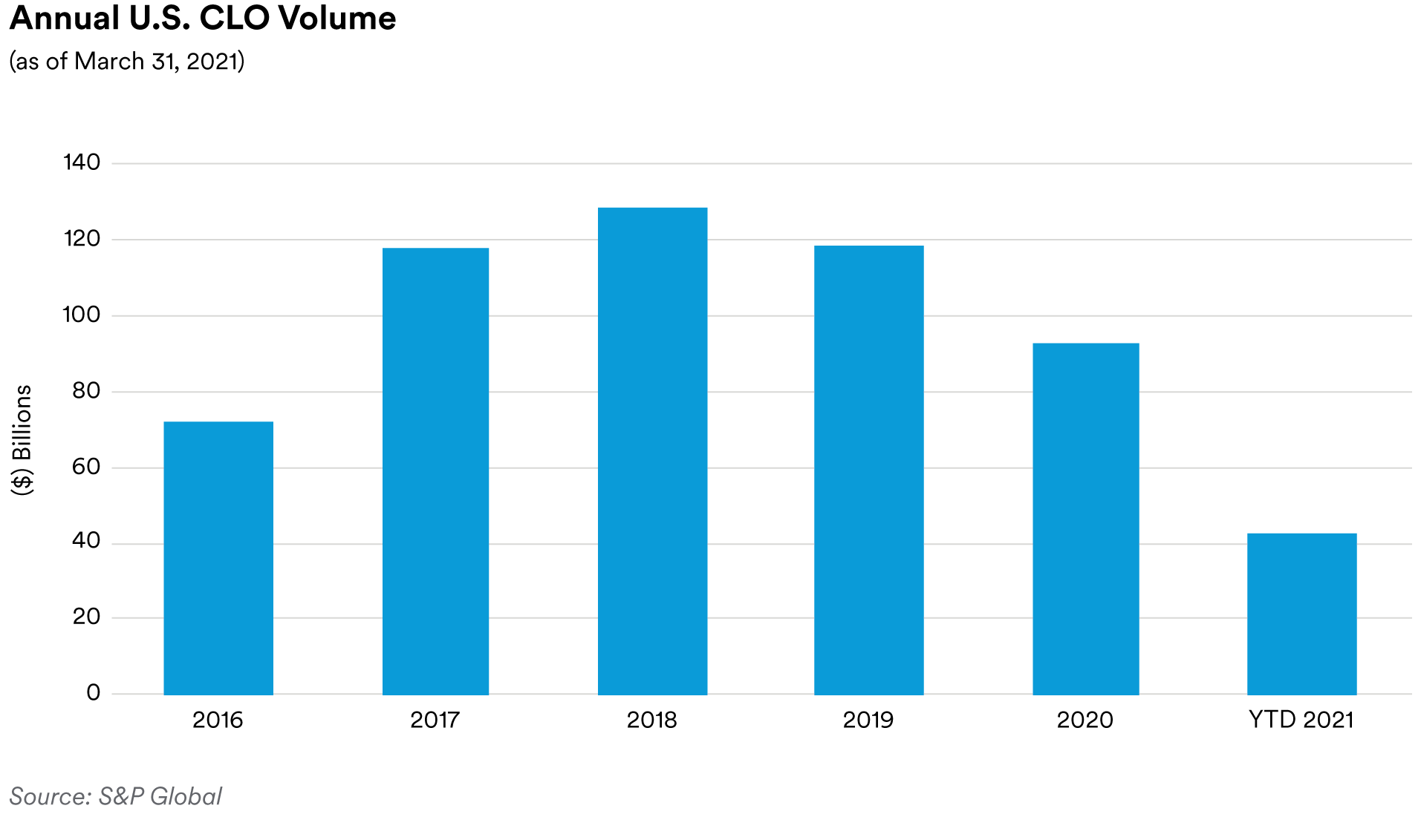 Recap: In comparison to like-duration Treasuries, CMBS securities showed mixed performance over the course of the first quarter. At the end of the quarter, three-year conduit tranches stood at a spread of 39 basis points over Treasuries (11 basis points wider). Three-year Freddie Mac “K-bond” tranches showed a similar relationship, ending the quarter at spreads of 43 basis points over Treasuries (4 basis points wider). Over the course of the quarter, over $75 billion of new issue CMBS came to market, well ahead of the $60 billion seen in the first quarter of 2020. The increase is attributable to heavy agency CMBS issuance, with over $52 billion of agency deals coming to the market in the first quarter of 2021, compared to $34 billion in last year’s first quarter. In non-agencies, the quarter was marked by heavy issuance in the “Other” category (a catchall subsector that includes CRE CLOs). Almost $9 billion of “Other” non-agency CMBS priced in the first quarter, along with $6 billion of conduit deals and $9 billion of single-asset, single-borrower (“SASB”) transactions.