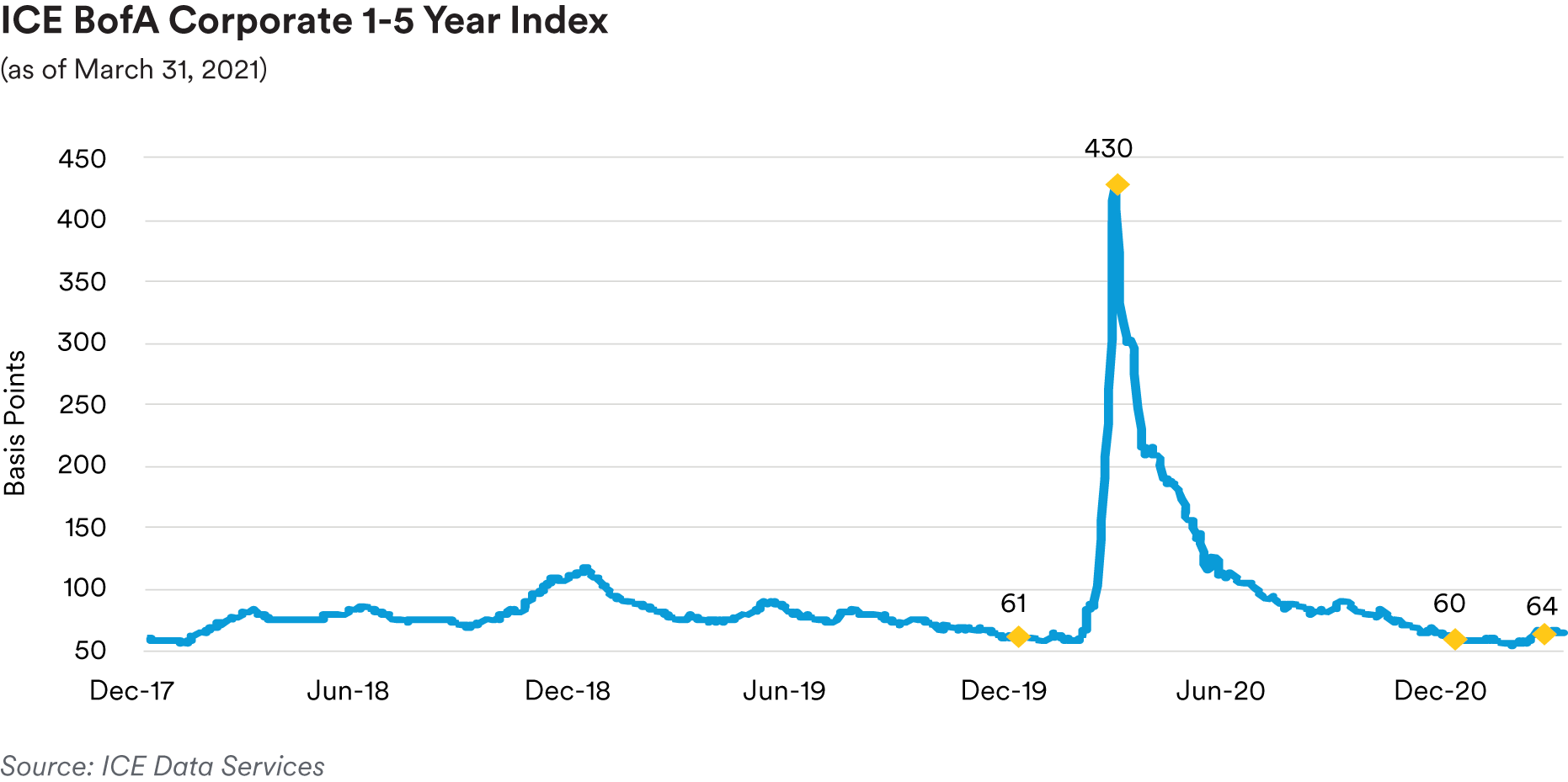 Portfolio Actions & Outlook: After our bellwether front-end 1-5 year investment grade corporate index started the year at an option-adjusted spread (OAS) of 60 basis points, not far above multidecade tights, the index OAS closed the quarter at 64 basis points. We continue to view valuations as somewhat stretched with a strong economic recovery priced in and little accounting for the potential volatility or bumps in the road as fiscal support potentially recedes later in the year, well before the U.S. labor market has completed its return to pre-pandemic health and many subsectors of the economy see demand restored to something approaching normal. Consequently, until the prevailing decoupling of fundamentals and valuations subsides, likely at wider spreads ultimately, we anticipate maintaining our mostly more defensive, up-in-quality approach to investing and hold sector weightings steady as we did in the first quarter.