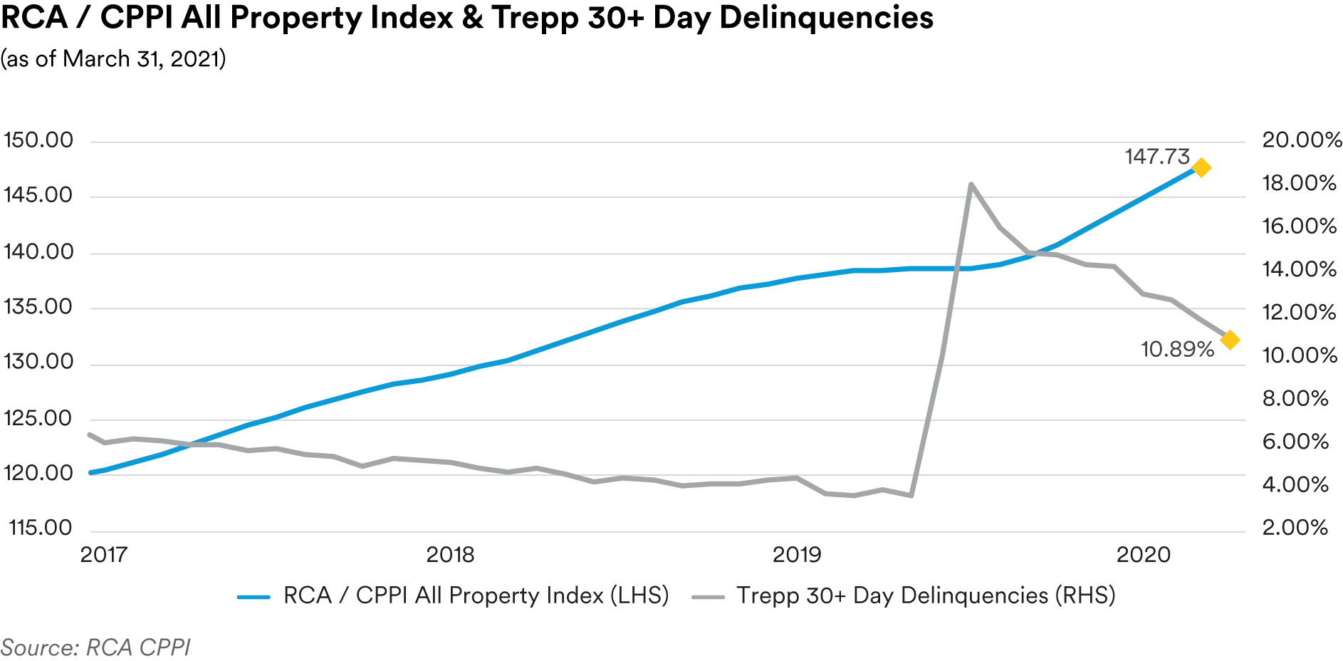 Continuing a trend seen since June of last year, CMBS delinquencies continued to decline over the course of the first quarter. The Trepp 30+-day delinquency rate ended the quarter at 6.58%, reflecting a drop of 22 basis points in March and a drop of 123 basis points in the first quarter. As a result of the pandemic, delinquencies had surged, reaching a peak of 10.32% in June (only slightly below July 2012’s 10.34% all-time high) but have since moved lower. Lodging properties remain the worst performing subsector despite lodging delinquencies dropping 385 basis points over the quarter to 15.95%. One year ago, prior to the pandemic, lodging delinquencies stood at only 1.53%. Retail properties saw delinquencies drop 205 basis points over the quarter to 10.89%. In comparison, retail delinquencies stood at only 2.89% at the end of last year’s first quarter. Industrial properties remained the best performers with delinquencies falling 41 basis points over the quarter to 0.73%. Notably, multi-family properties saw delinquencies rise 84 basis points in March to end the quarter at 3.14%, an increase of 39 basis points over the quarter. While the increase in multi-family delinquencies bears watching, we do not believe it presents a meaningful risk to our portfolios due to the healthy demand for rental properties and large-scale government stimulus programs supporting consumers.