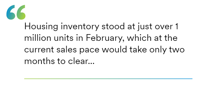 Home sales trended lower over the quarter, pulling back from the dramatic pace seen in the second half of last year. March’s release showed existing home sales dropping to a six-month low in February, coming in at a 6.2 million annualized pace, the result of a record 29.5% decline in inventory when compared to year-ago inventory numbers. Housing inventory stood at just over 1 million units in February, which at the current sales pace would take only two months to clear. Anything below five months of supply is considered indicative of a tight market. New home sales have also softened with March’s release showing sales printing at a 775,000 annualized pace through February, a nine-month low. In addition to tight inventories, we attribute some of the slowdown in home sales to the abnormally cold weather seen in many parts of the country (Texas, in particular) during the quarter.