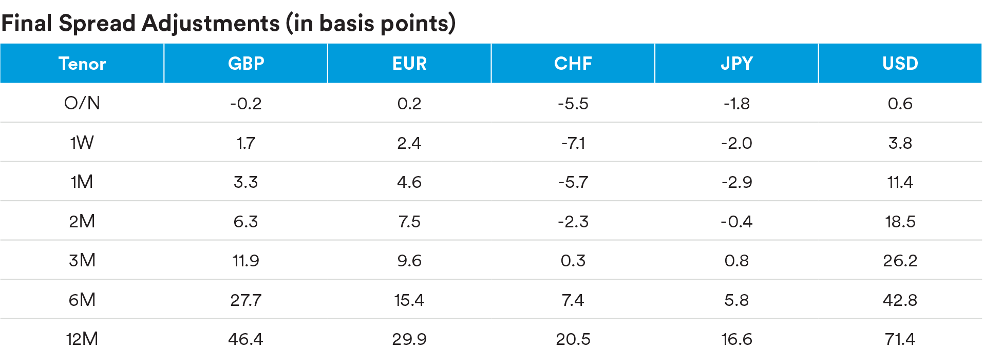 A key consideration in the LIBOR transition has been how to account for the absence of a credit component in SOFR. This is particularly relevant for contracts referencing LIBOR that will subsequently shift to reference SOFR upon LIBOR’s cessation, anticipated to occur in two years. For these contracts, the index rate needs to “fallback” from LIBOR to SOFR in a way that minimizes any potential value transfer among the contract participants to the extent possible. As a result of several industry-wide consultations by the ARRC and the International Swaps and Derivatives Association, standard fallback language was created for many types of financial instruments. In addition, the methodology for calculating the spread adjustment between SOFR and LIBOR was established (a five-year historical median between term LIBOR and SOFR). These spread adjustments have been fixed for all LIBOR tenors as a consequence of the FCA’s official cessation announcement for LIBOR in March 2021. As an example, the spread adjustments to convert from 1-month USD LIBOR and 3-month USD LIBOR have been set at SOFR + 11.4 basis points and SOFR + 26.2 basis points, respectively. The table below details the official spread adjustments announced across various tenors and currencies.