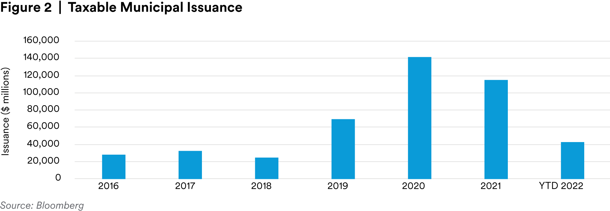 One interesting dynamic in the Taxable Municipal market this year has been the dearth of new issuance, driven by a surge in rates and a corresponding decline in taxable advanced refundings that previously fueled a surge in taxable issuance in 2019-2021. Through the third quarter and as shown in Figure 2, issuance of Taxable Municipals (municipal CUSIPs only) stands at $42.6 billion—a 49% decline year-over-year and a whopping 59% year-to-date decline relative to the record year in 2021. The most recent quarter is the first quarter we can recall in years with precisely zero issuance of Taxable Municipals with corporate CUSIPs (these are typically issued by nonprofit hospitals, universities, and not-for-profit institutions like foundations or museums). The decline in issuance has made price discovery for Taxable Municipals more challenging, which in turn has hampered liquidity. The pockets of liquidity that do exist have become more bifurcated, whereby large Taxable Municipal securities are relatively liquid but the trading volume for smaller securities and/or less well-known issuers is scarce. This is not in itself surprising given that CUSIP size is a logical proxy for potential liquidity. However, it does highlight an interesting predicament for the Taxable Municipal market, where only 309 (or 3.2%) of the almost 10,000 securities in the Bloomberg Taxable Municipal index are eligible for the broad US Credit Index by virtue of the $300 million minimum CUSIP size: liquidity is concentrated in a narrow segment of the market. This observation is supported by our examination of trading data for the three largest and the three smallest securities in the Bloomberg Taxable Municipal Index. We find that despite a 49% decline in Taxable Municipal issuance year-to-date through the third quarter, the trading volume for the three largest Taxable Municipal CUSIPs in the Bloomberg Aggregate Eligible Index increased by an average of 340% in third quarter of 2022 relative to the third quarter of 2021. Conversely, the trading volume for the three smallest Taxable Municipal CUSIPs in the index decreased by an average of 80% over the same time period (source: Bloomberg, MIM). We see this bifurcation as a potential risk to returns from the mispricing of less liquid securities in the short-term. However, we also see it as an opportunity for long-term investors to lock in significantly higher yields by providing liquidity on highly rated but smaller, less liquid securities at significantly wider spreads. In a market that prioritizes liquidity, we like taking some amount of liquidity risk over credit risk in portfolios heading into a likely recession in 2023.