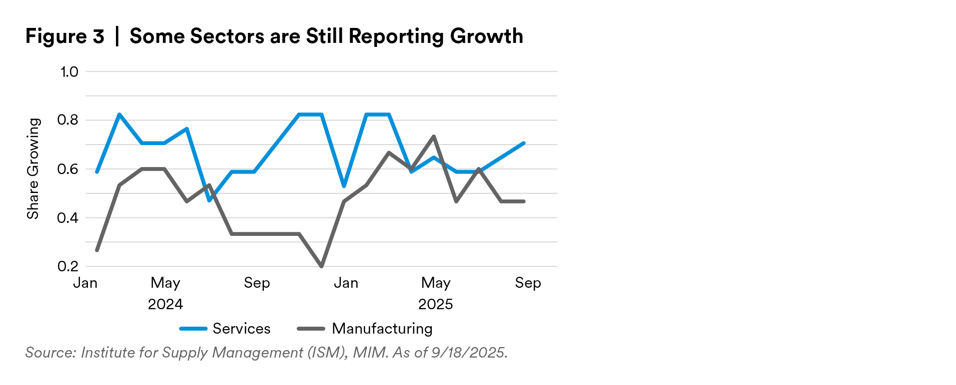 High uncertainty from geopolitics, tariffs, and fiscal policy has caused manufacturing-related construction activity to slide, and many firms are focusing on reducing costs rather than expanding headcount. The sector overall has been in contraction for 32 out of the last 34 months.