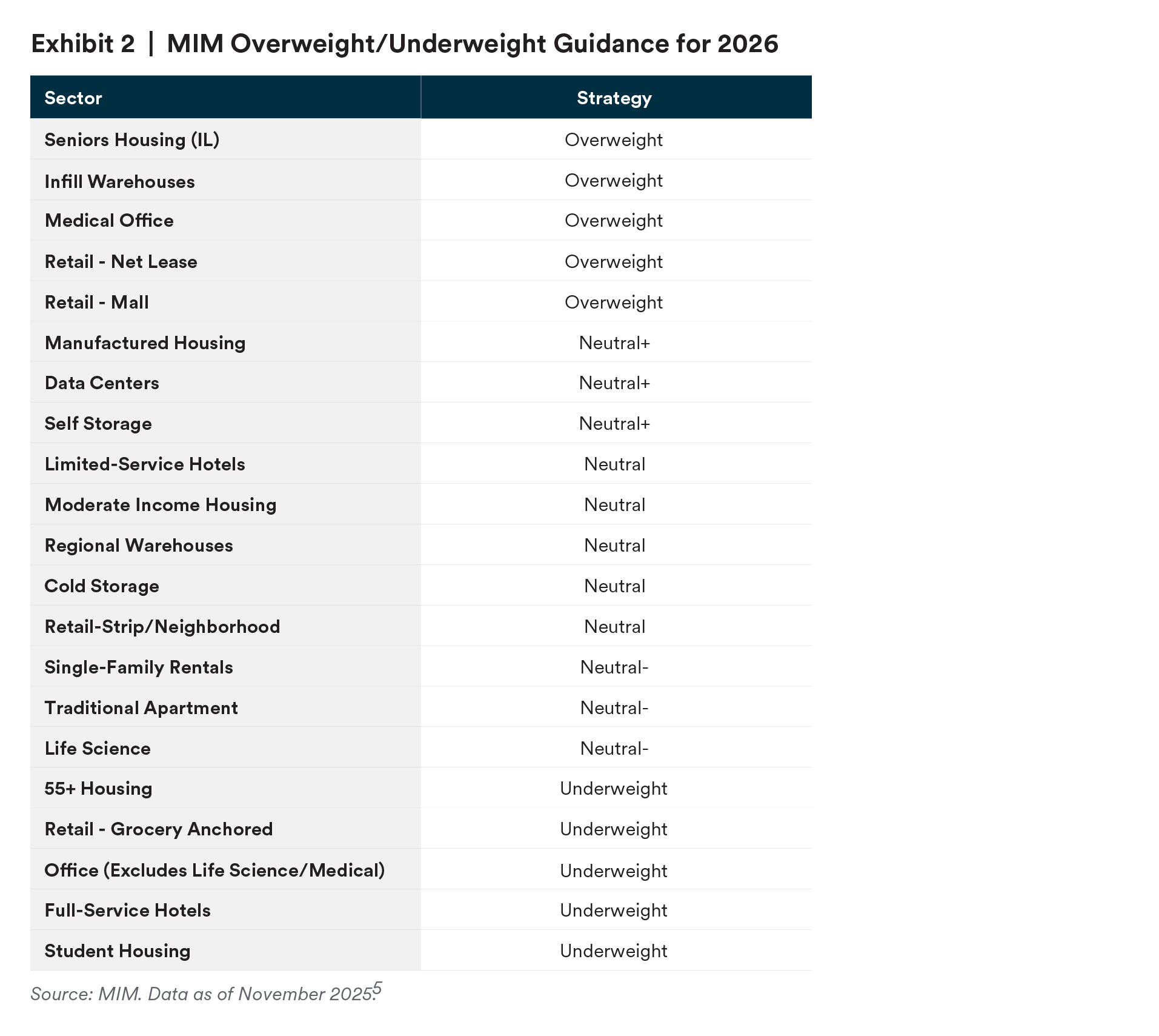 In 2026, we expect leasing demand across most product types to be tied less to national aggregates and more to where high-value employment and wage gains concentrate. That supports coastal multifamily and select office submarkets, while tempering some Sun Belt locations.