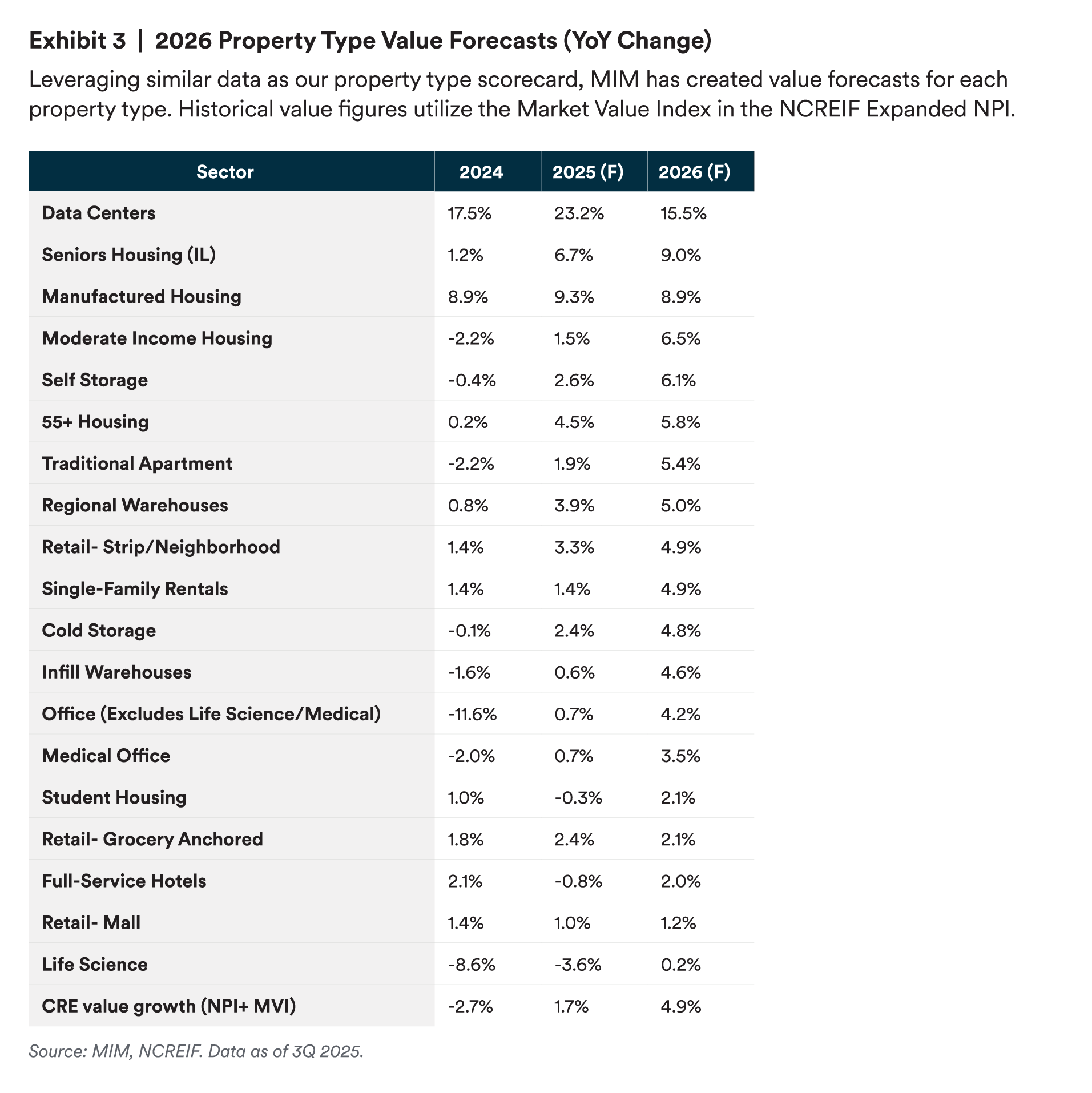 Where are the opportunities and risks today? Here are the property types we expect to perform, best to worst, in 2026, considering both spot market pricing and current fundamentals.