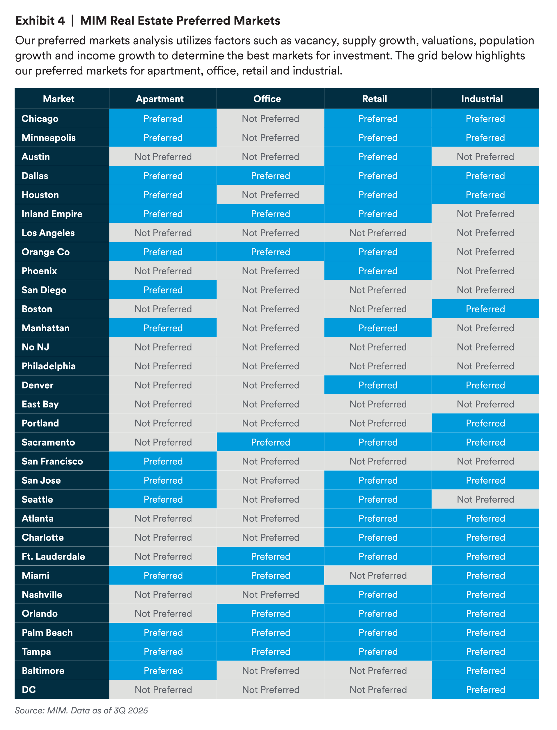 - Oversupplied multifamily markets such as Austin, Charlotte, Nashville, Denver, Phoenix and Atlanta. Aggressive underwriting persists despite elevated vacancy rates and flat-to-negative net effective rent growth. Federal immigration reform further impedes the recovery in fundamentals.