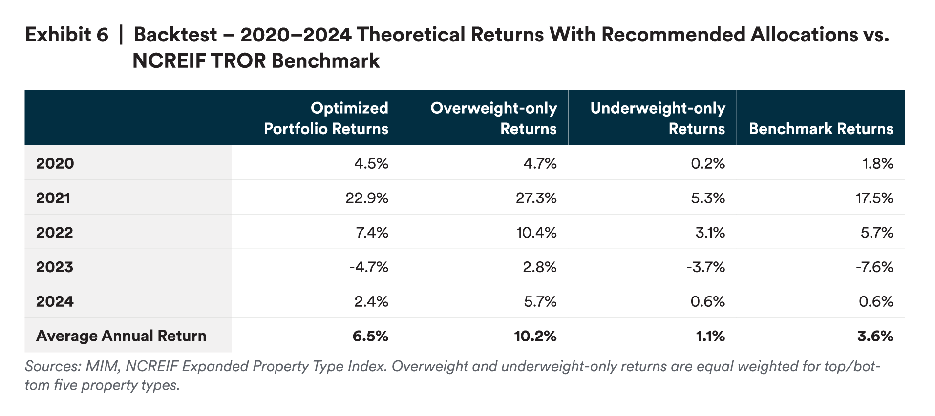 - An unlevered portfolio modestly tilted toward overweight types, and away from underweight, would have returned 6.5% from 2020 to 2024, while the NCREIF Property Index (NPI) benchmark was 3.6%.