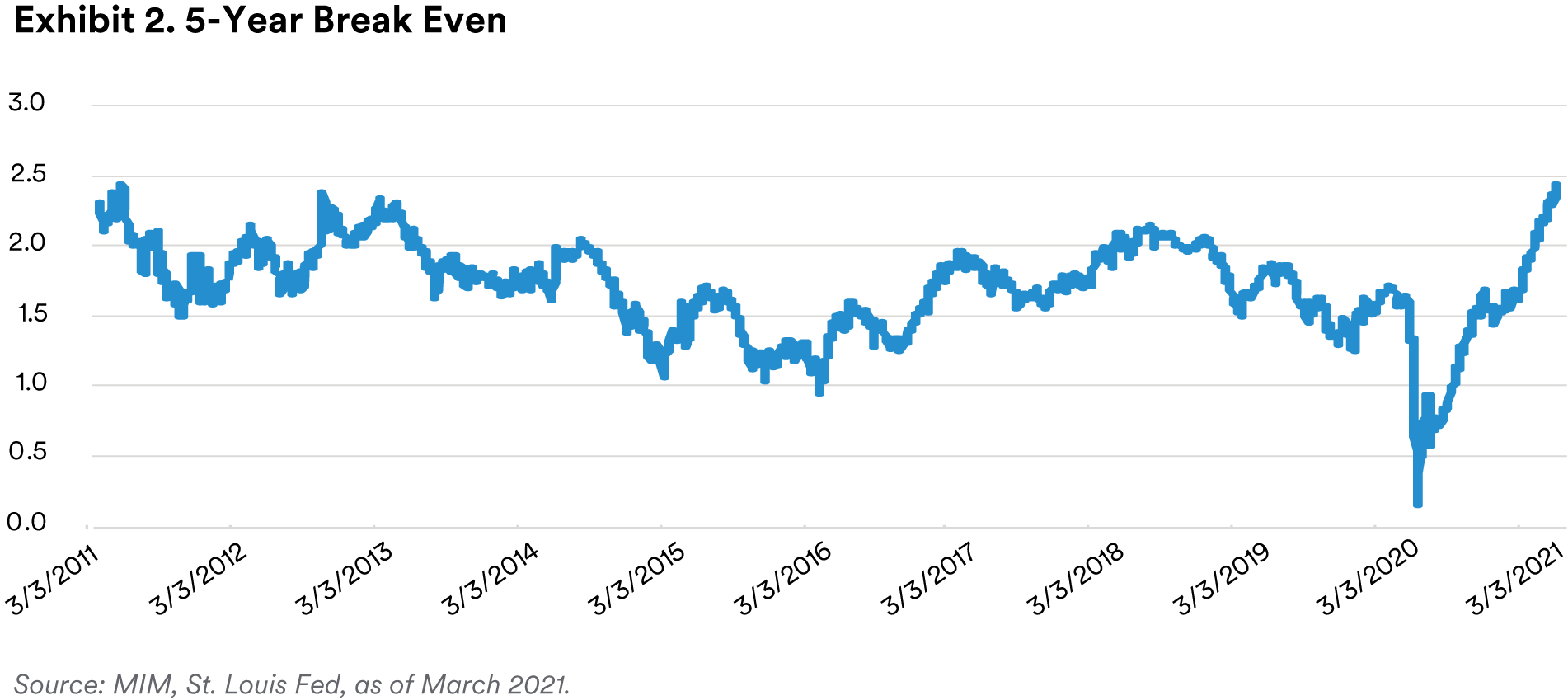 A recovering economy and multiple rounds of fiscal stimulus have stoked inflation fears and sent treasuries sharply higher in recent months. Shown in Exhibit 2, the U.S. 5-yr inflation breakeven rate – an indicator of where the market believes inflation will be in five years – recently reached its highest level (2.45%) since the wake of the Global Financial Crisis.