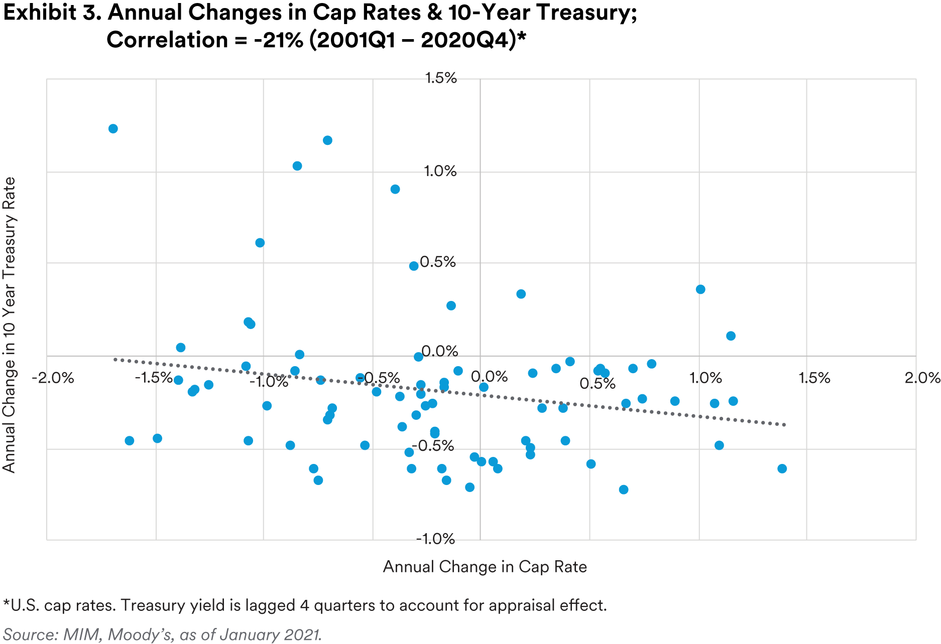 Looking forward, we expect an improving economy to drive down risk premiums across the investment spectrum, including commercial real estate. We believe this will translate to a compressing cap rate spread to the 10-year treasury, and declining cap rates, even as treasury rates rise off their COVID lows. If treasuries rise to the mid-2% range, and U.S. GDP growth remains in the 5% to 7% range, then we would begin to be concerned about potential cap rate expansion.