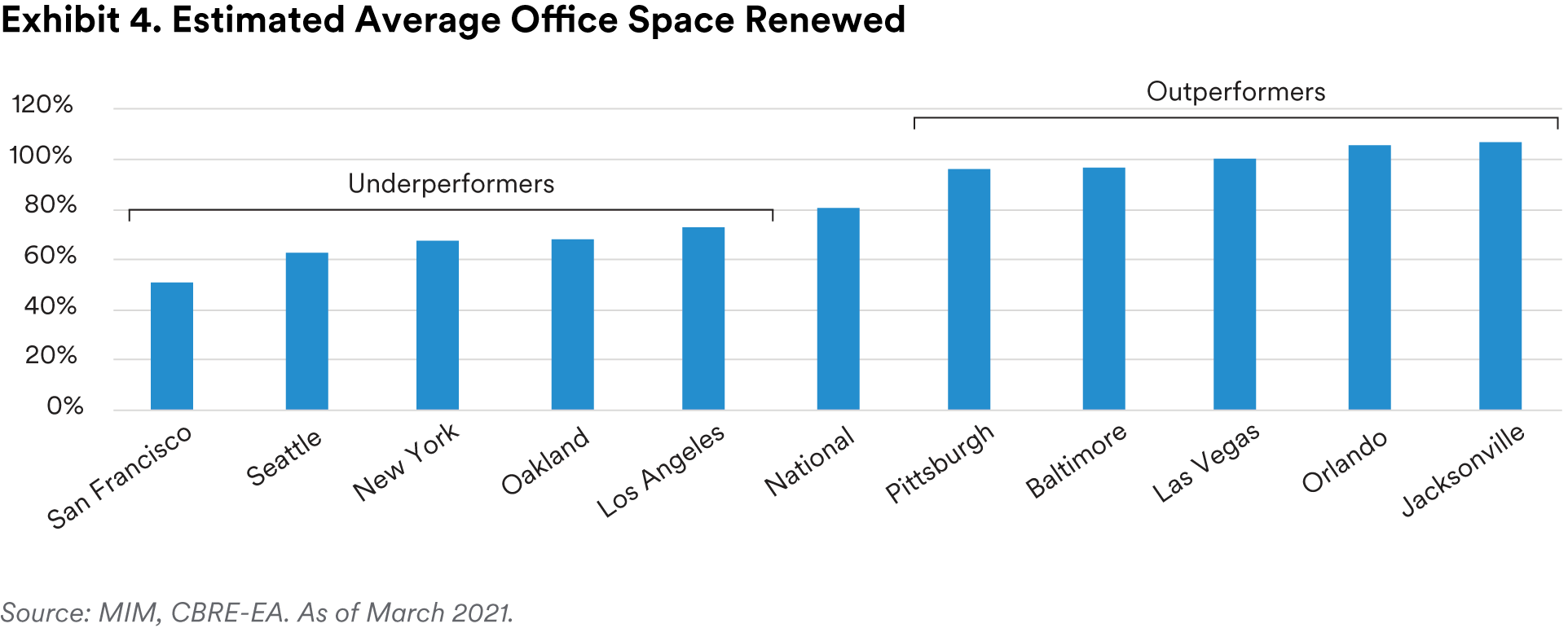In Exhibit 4, we modeled renewals for both 3Q20 and 4Q20. Markets such as San Francisco, New York, and Seattle have experienced some of the lowest average rates of office space renewal, compared to the rest of the U.S., which averaged an 80% renewal rate. On the flip side, of the total office space that was up for renewal during the second half of 2020, more than all of it was absorbed / renewed in markets such as Orlando and Jacksonville (each over 100%). The standard vacancy statistics also confirm this trend, with markets like San Francisco rising from 5.2% to 11.7%, and markets like Minneapolis only rising from 18.5% to 18.9%.