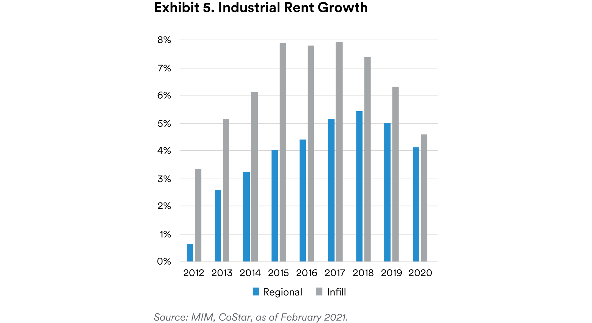 Industrial occupiers are more willing to absorb large rent increases in assets that are located in densely populated areas, also referred to as “infill” assets. These buildings enable third party logistics providers to satisfy the burgeoning demand for faster delivery times, and have notably outperformed their regional counterparts over the last cycle. Since the GFC, infill industrial rent growth has averaged 6.3% annually, while regional assets averaged 3.9% annually (Exhibit 5).