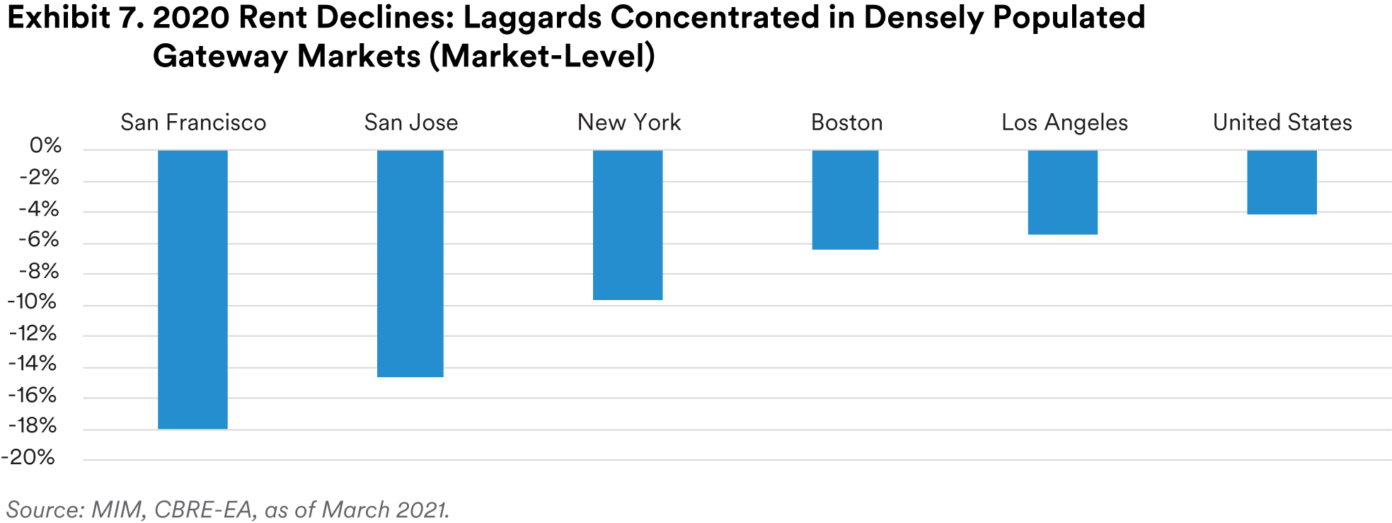 Demand growth moderated only slightly for the apartment sector in 2020 as vacancies ticked up from 4.1% to 4.5%.13 That said, assets located in central business districts (CBD) have struggled more than their suburban counterparts, and rents in CBD locations remain below their pre-pandemic peaks14. With employees no longer commuting to the office and working from home, the appeal of living in high-cost urban areas has temporarily shown signs of deterioration; as such, densely populated gateway markets such as San Francisco and New York have struggled over the last 12 months (Exhibit 7).