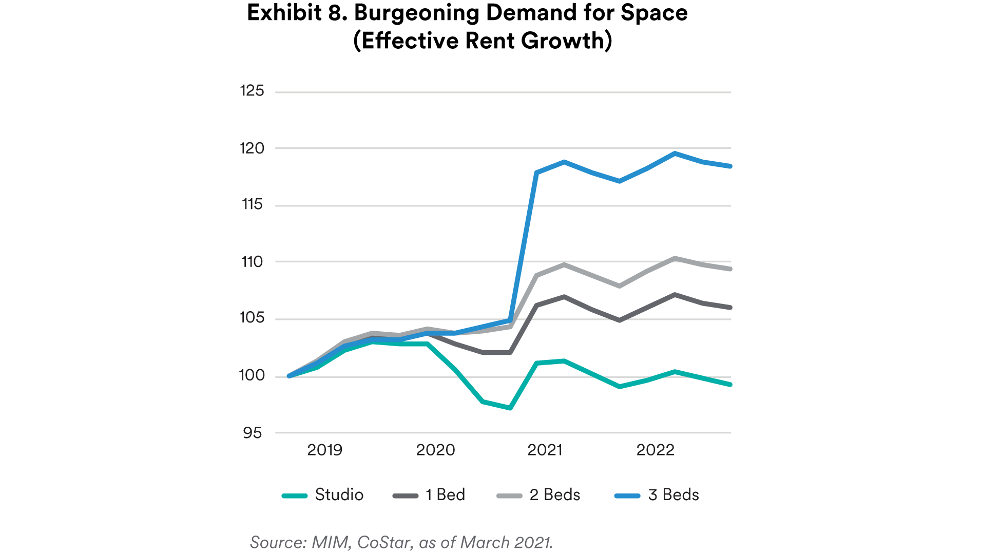 One additional important and sometimes overlooked dynamic of apartment leasing over the last year has been the demand for larger vs smaller units. As illustrated in Exhibit 8, three-bedroom apartment rents never skipped a beat throughout the pandemic, and have been growing at a faster clip relative to other unit types.