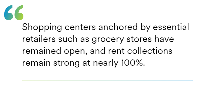 Around 25,000 retail stores were closed last year9, although the challenges were not evenly distributed. Malls, for instance, make up less than 10% of total existing retail space, yet they accounted for roughly 35% of the existing retail footprints of all of the retailers that announced closures in 2020.10 On the flip side, shopping centers anchored by essential retailers such as grocery stores have remained open, and rent collections remain strong at nearly 100%.11