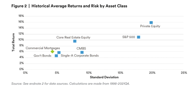 Commercial real estate performance has little to no correlation to other major assets, with the exception of commercial mortgage-backed securities. From 1998-2021, the average correlation of commercial mortgages to other major asset classes was 0.25.10 Lower correlations mean commercial mortgages have the potential to improve the overall risk-adjusted performance of a large institutional portfolio.